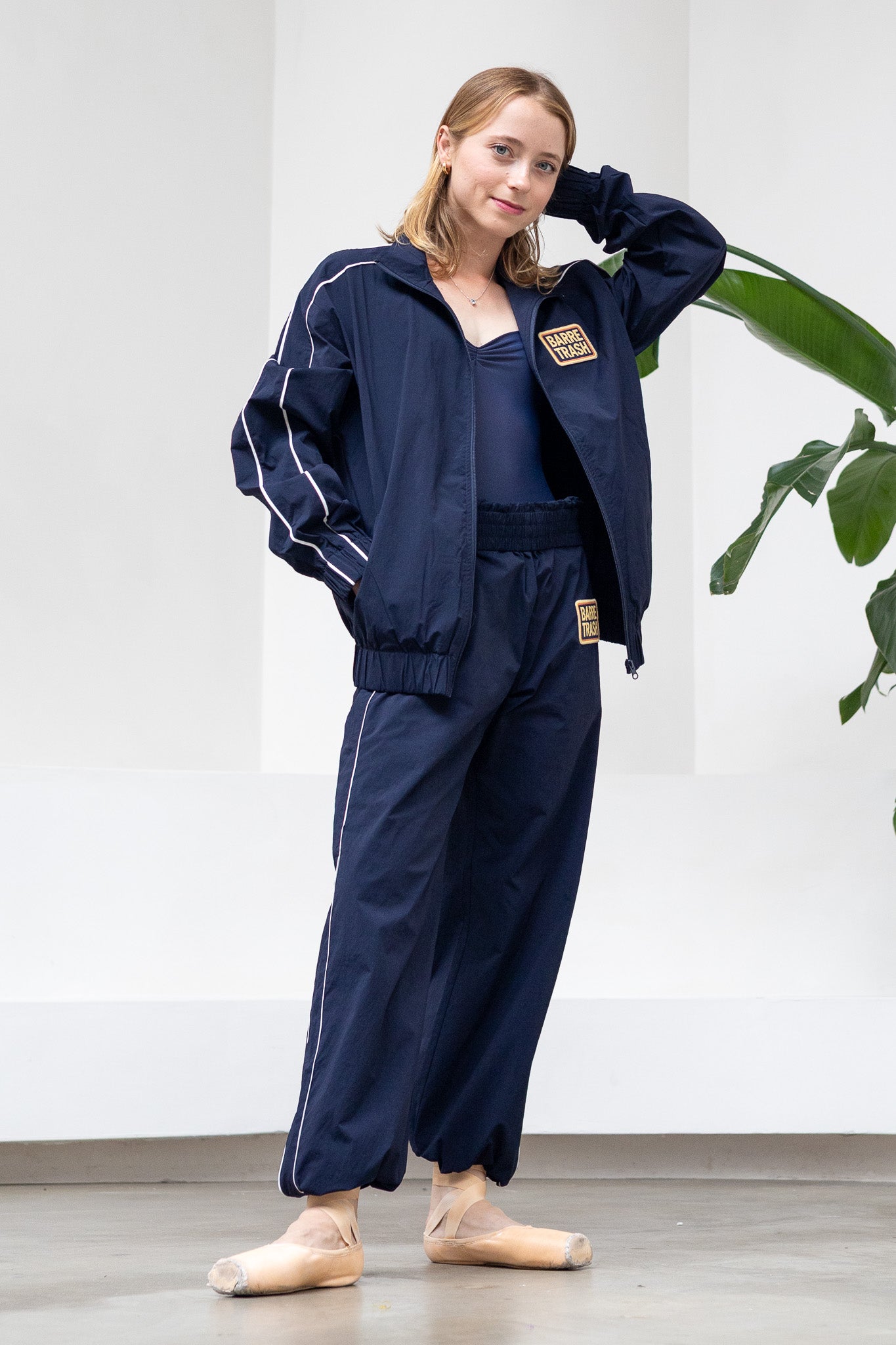 The track suit jacket is unlined, with two side pockets, long arms, a front zipper closure and an embroidered "Barre Trash" patch on the chest.