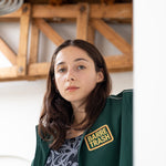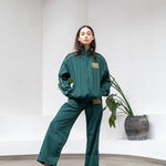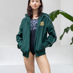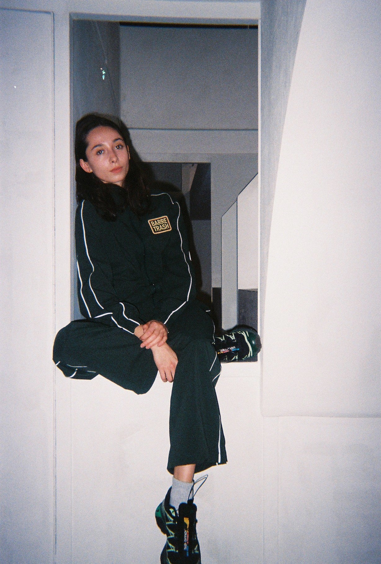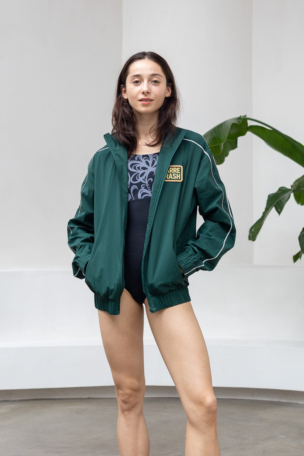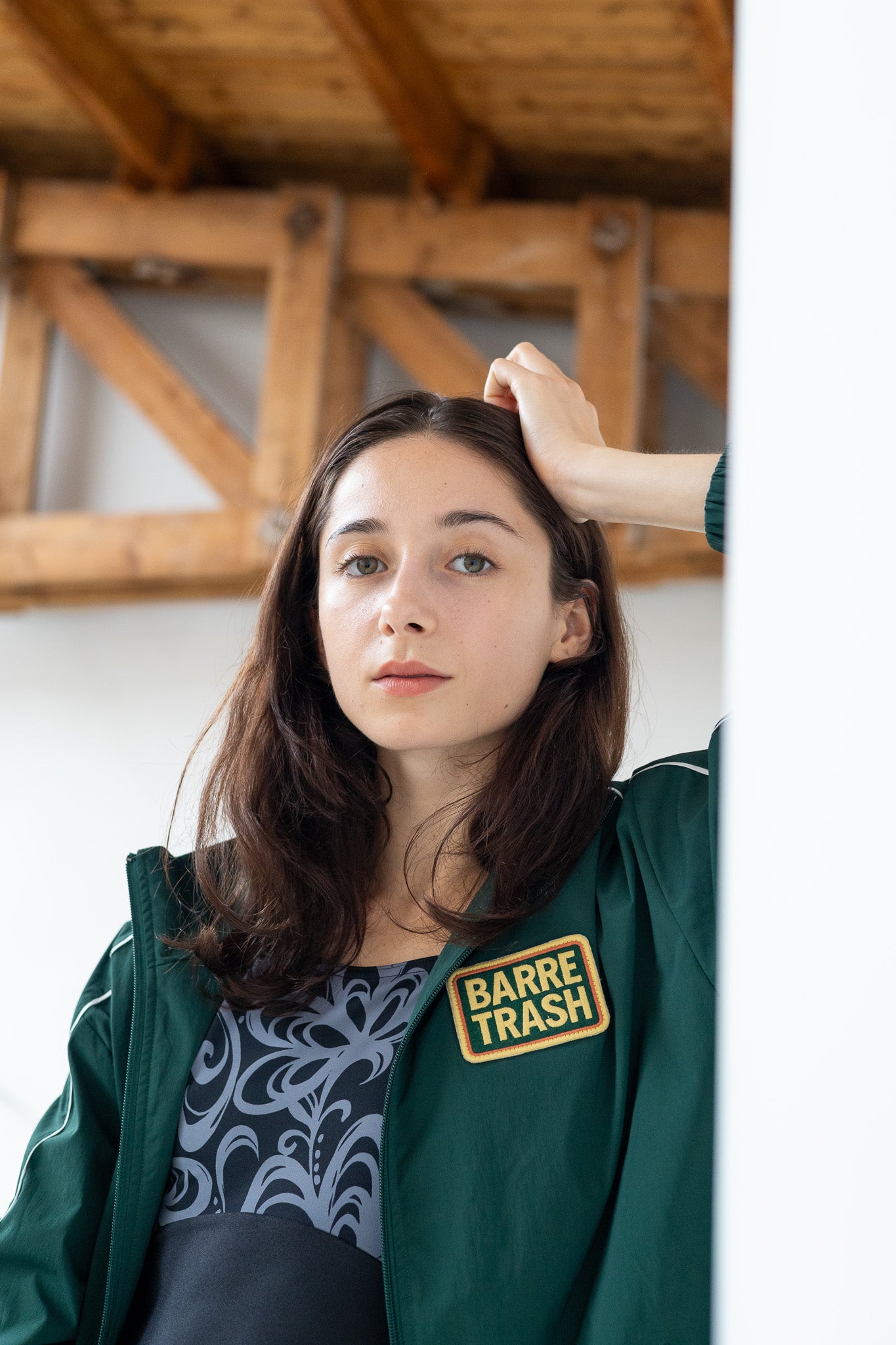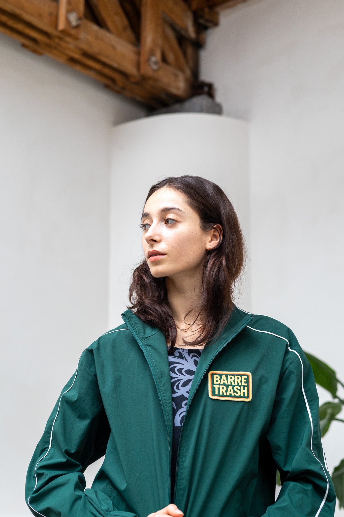 The track suit jacket is unlined, with two side pockets, long arms, a front zipper closure and an embroidered "Barre Trash" patch on the chest.
