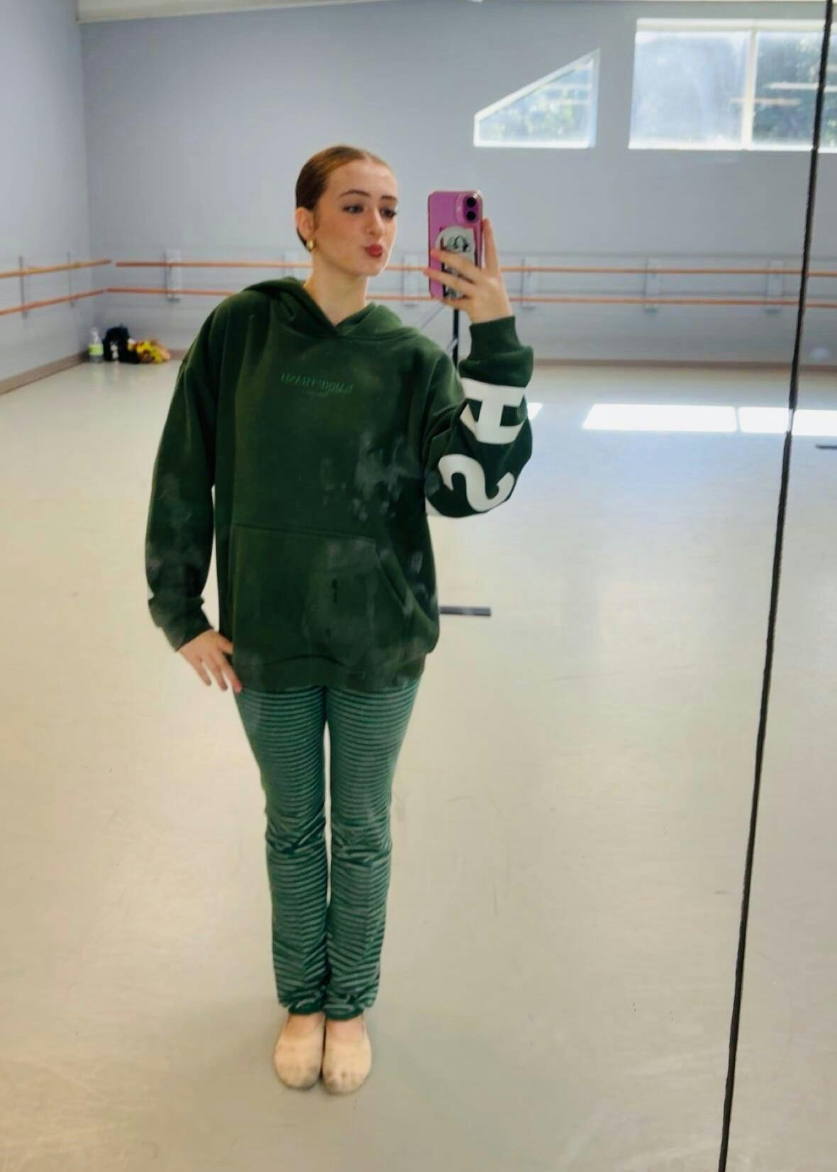 My dancer loves Barre Trash here in Louisiana! So comfy and cute! She is adding to her collection piece by piece. We love the Green Drop! Mamie is 5’6” and wearing the small in the oversized hoodie and xs/s in the leg warmers.