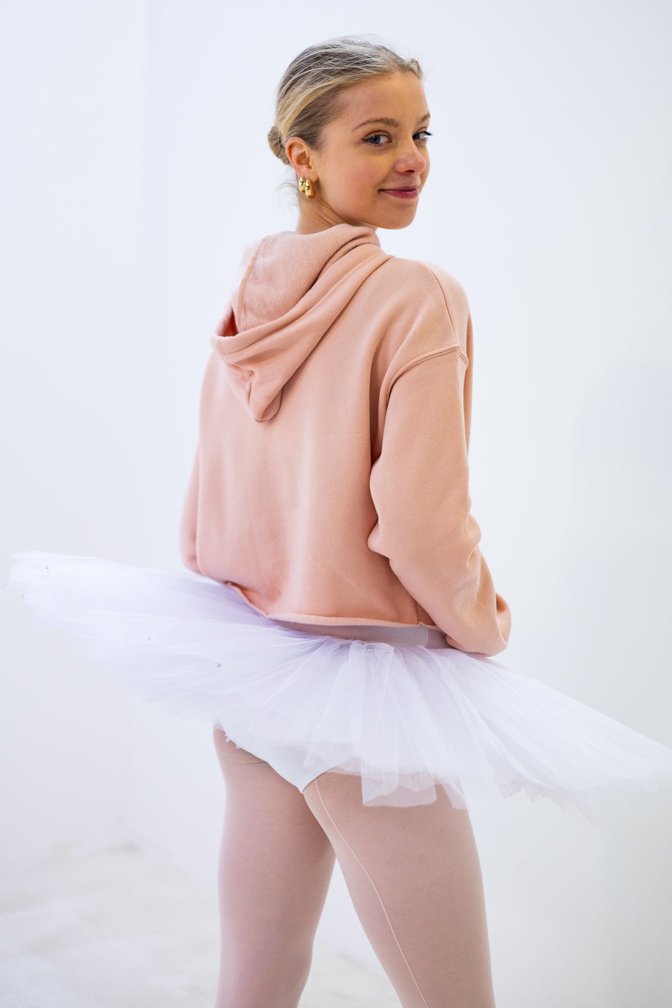 Our premium cropped hoodie won't cover up your lines or get in the way. Layer it over a sports bra for jazz class or use it as a cover up to stay warm during tendus.
