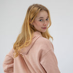 Our crop hoodie fits true to size. It's soft and flowy with a wide, box-cut fit.