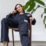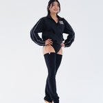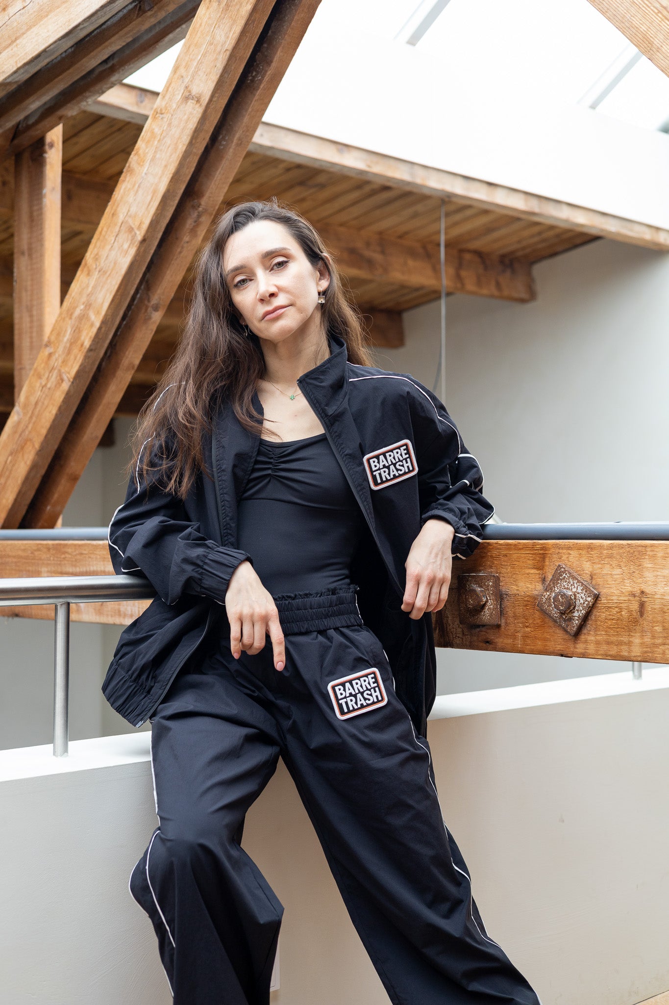 The track suit jacket is unlined, with two side pockets, long arms, a front zipper closure and an embroidered "Barre Trash" patch on the chest.
