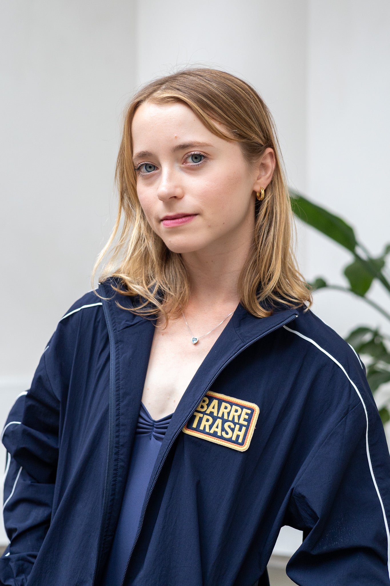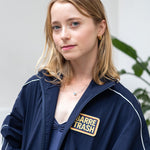 The track suit jacket is unlined, with two side pockets, long arms, a front zipper closure and an embroidered "Barre Trash" patch on the chest.