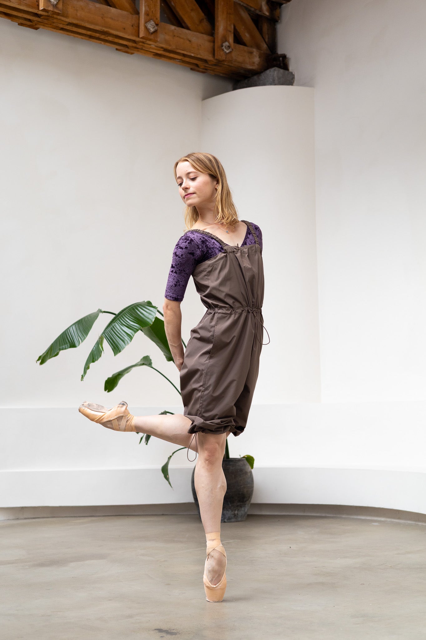 With a tie at the waist, and adjustable drawstrings at the chest and thigh, they're designed to stay with you during warm up, class, and rehearsal. Loose enough to move with you, without getting in the way.
