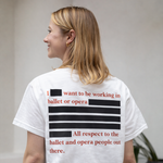 Our usual white tee... customized for this moment. We use 1% of our sales to support artists, and we're a brand created and run by two professional ballet dancers. Ballet and Opera People: YOU are OUR people. This limited edition tee is about showing and sharing our love.