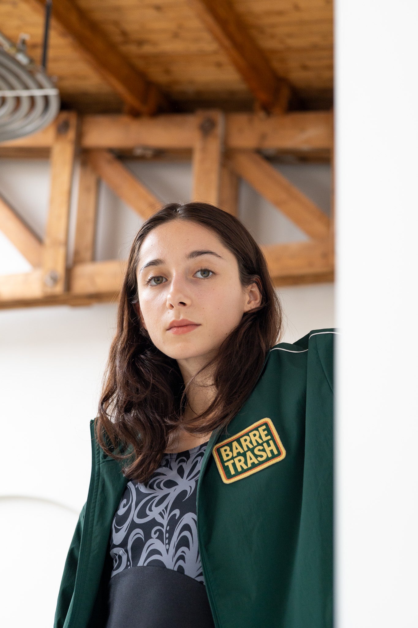 The track suit jacket is unlined, with two side pockets, long arms, a front zipper closure and an embroidered "Barre Trash" patch on the chest.