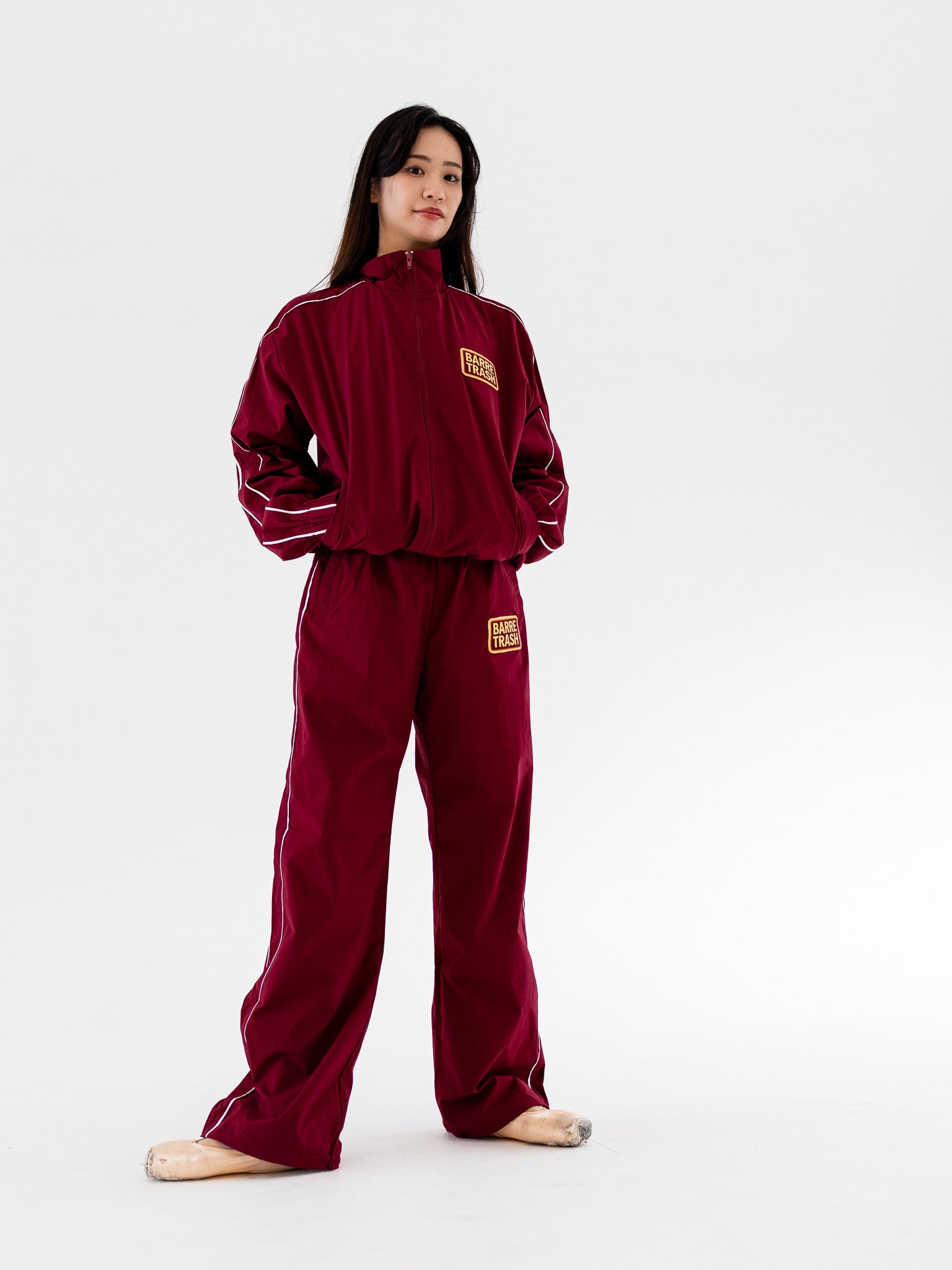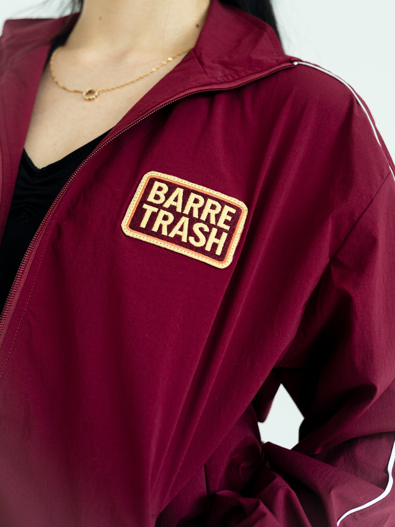 The track suit jacket is unlined, with two side pockets, long arms, a front zipper closure and an embroidered "Barre Trash" patch on the chest. Combine with the pants to save $30!