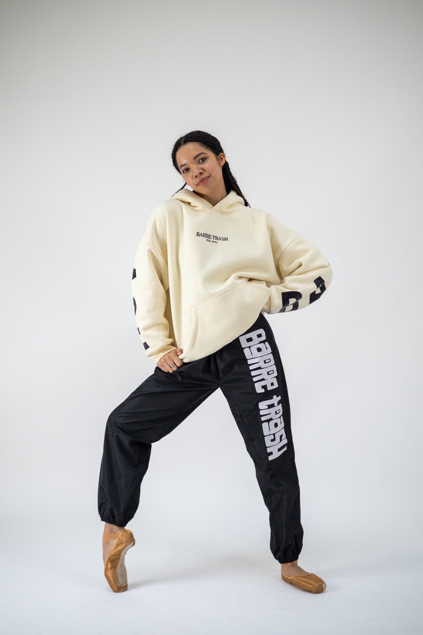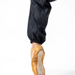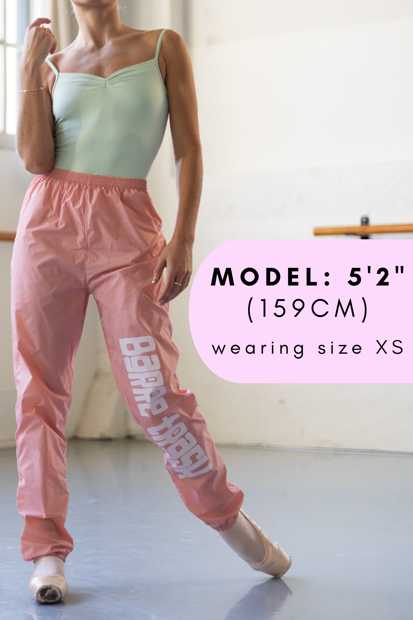 It's a trashbag pant that moves with you, keeps you warm, and doesn't get in the way. Our pants taper slightly more than traditional ones, so that you can see your lines, cross your fifth, or slide them up to wear with pointe shoes in rehearsal.